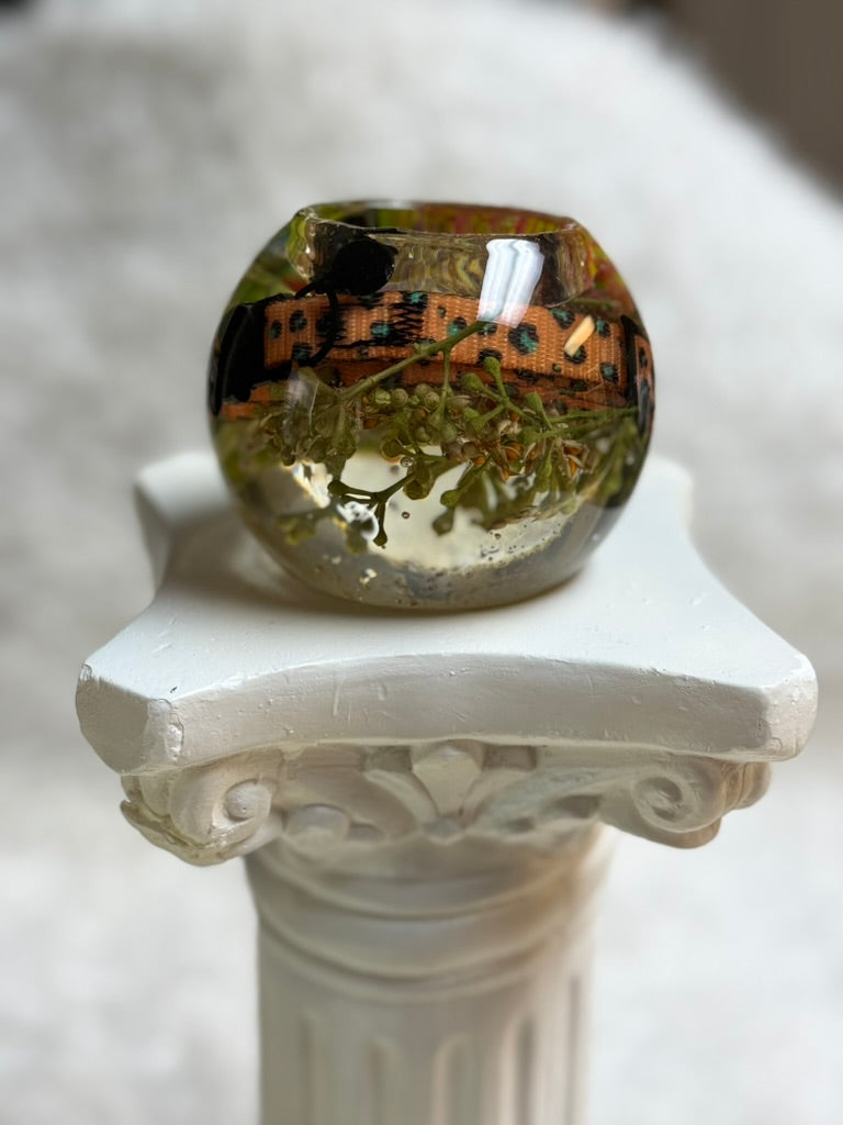 Hand-poured with your preserved flowers, this round resin piece is designed with a central opening to hold a tealight or LED candle. The light shines through the flowers, creating a warm and romantic glow. Perfect as a centerpiece, memorial candle, or bedside accent.