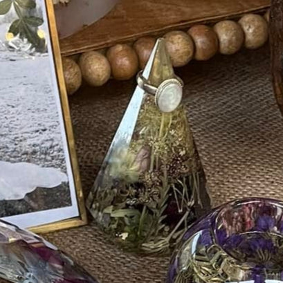 Our resin ring holder is a beautiful and functional keepsake that turns your preserved flowers into a daily reminder of your most special moments. Hand-poured with real blooms from your bouquet, each cone-shaped holder is unique and perfectly sized to display engagement rings, wedding bands, or heirloom jewelry.